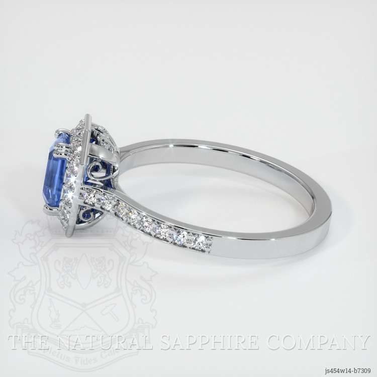 The ring features a beautiful, transparent 1.04 carat emerald cut shape blue sapphire with the dimensions of 6.62 x 4.68 x 3.68 mm and a emerald cut. It has a clarity grade of very slightly included (evaluated at eye level), medium intense color saturation, and an excellent polish. The origin of this sapphire is Ceylon (Sri Lanka).