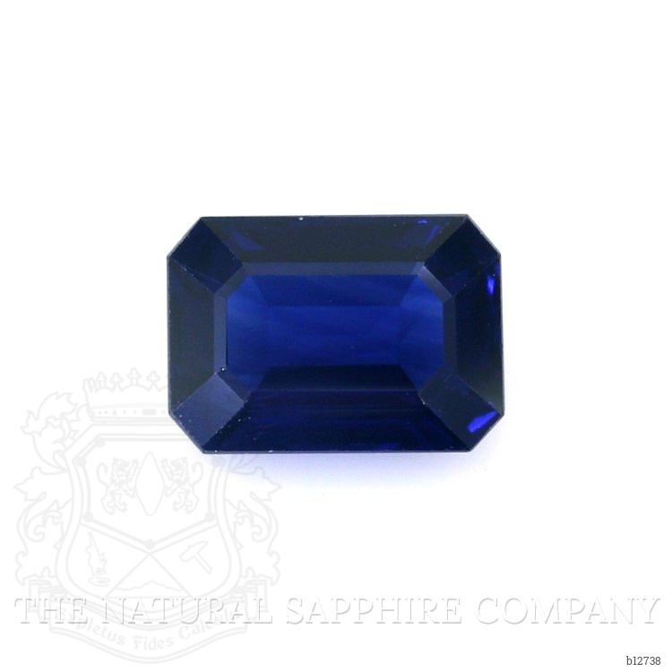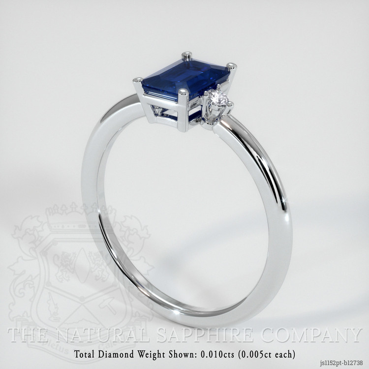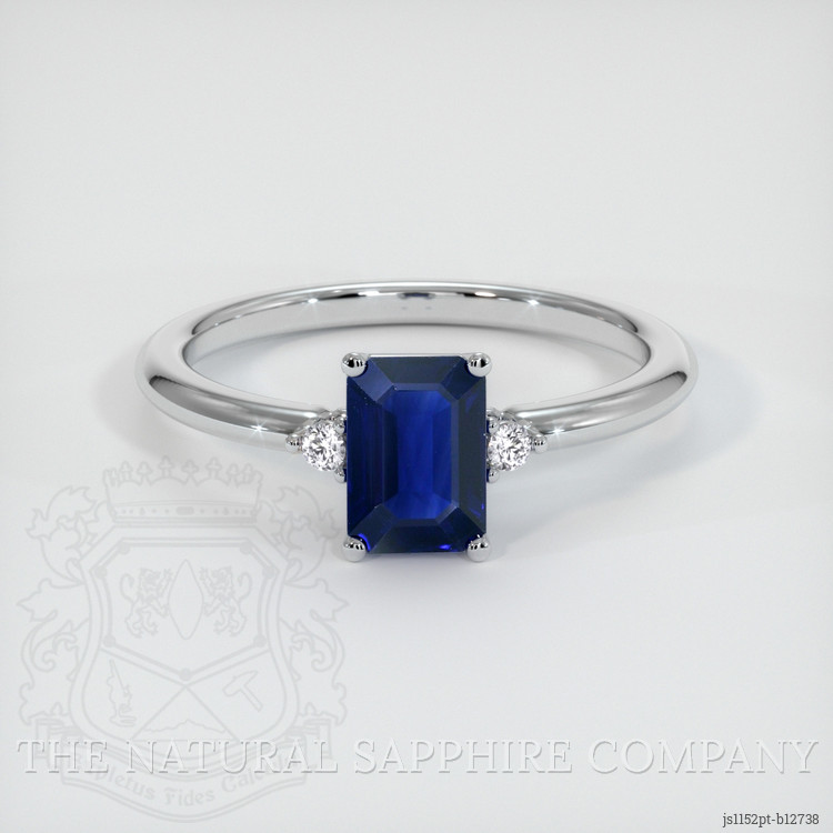 The ring features a beautiful, transparent 1.07 carat emerald cut shape blue sapphire with the dimensions of 6.84 x 4.86 x 2.91 mm and a emerald cut. It has a clarity grade of eye clean (evaluated at eye level), vivid color saturation, and an excellent polish. The origin of this sapphire is Thailand.
