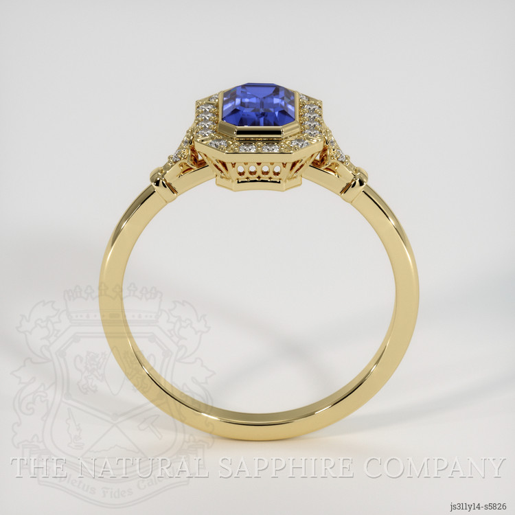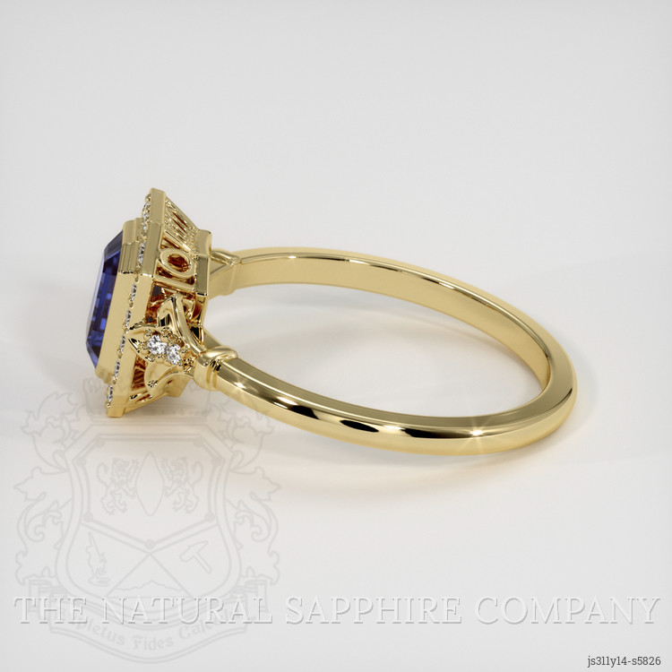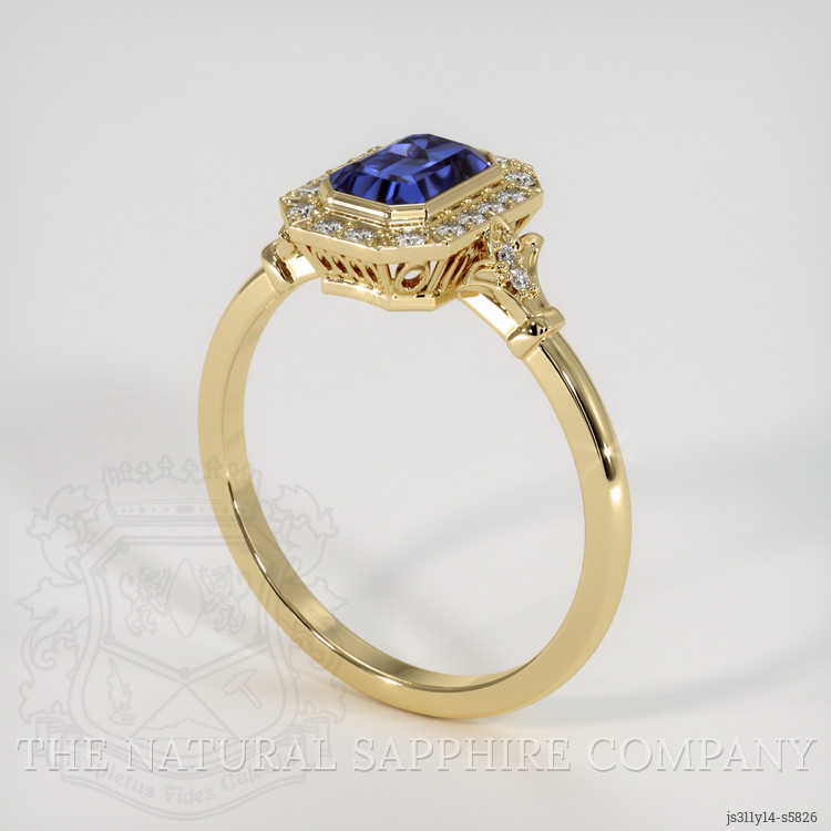 The ring features a beautiful, transparent 1.09 carat emerald cut shape blue sapphire with the dimensions of 6.92 x 4.93 x 3.22 mm and a emerald cut. It has a clarity grade of eye clean (evaluated at eye level), intense color saturation, and an excellent polish. The origin of this sapphire is Ceylon (Sri Lanka).