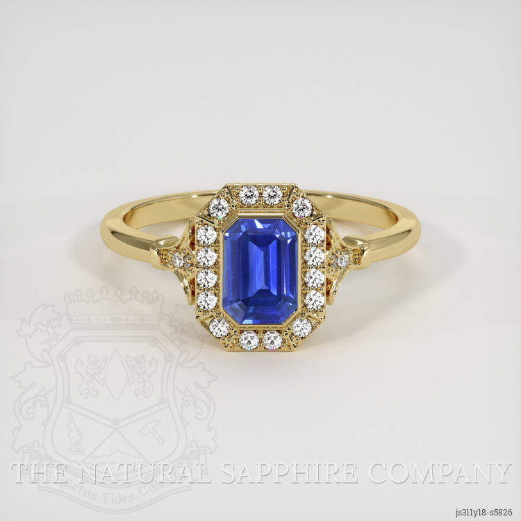 The ring features a beautiful, transparent 1.09 carat emerald cut shape blue sapphire with the dimensions of 6.92 x 4.93 x 3.22 mm and a emerald cut. It has a clarity grade of eye clean (evaluated at eye level), intense color saturation, and an excellent polish. The origin of this sapphire is Ceylon (Sri Lanka).