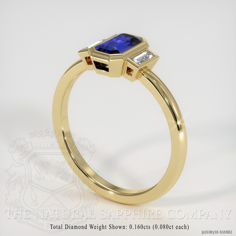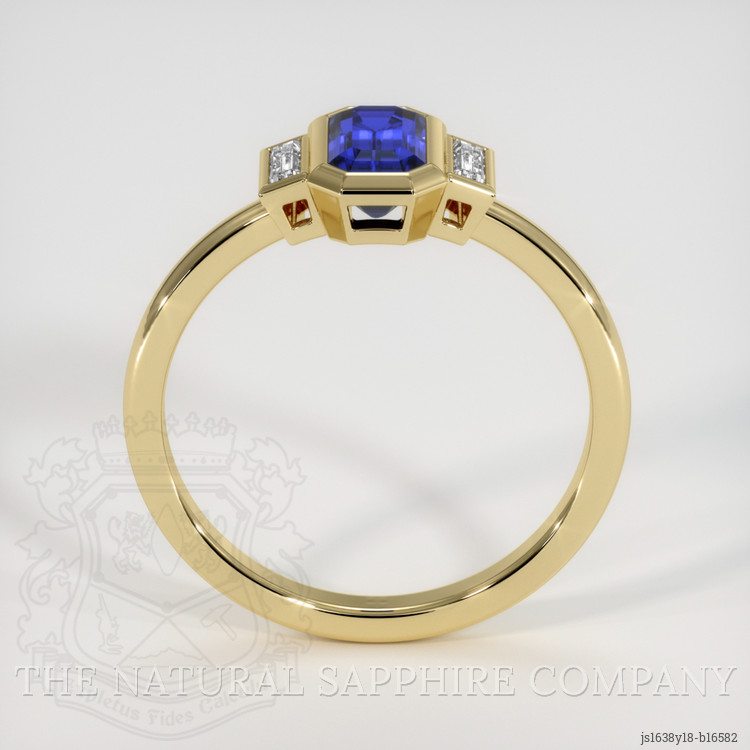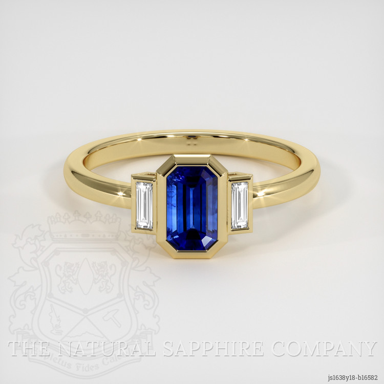 The ring features a beautiful, transparent 1.20 carat emerald cut shape blue sapphire with the dimensions of 7.29 x 4.31 x 3.65 mm and a emerald cut. It has a clarity grade of slightly included (evaluated at eye level), vivid color saturation, and an excellent polish. The origin of this sapphire is Ceylon (Sri Lanka).
