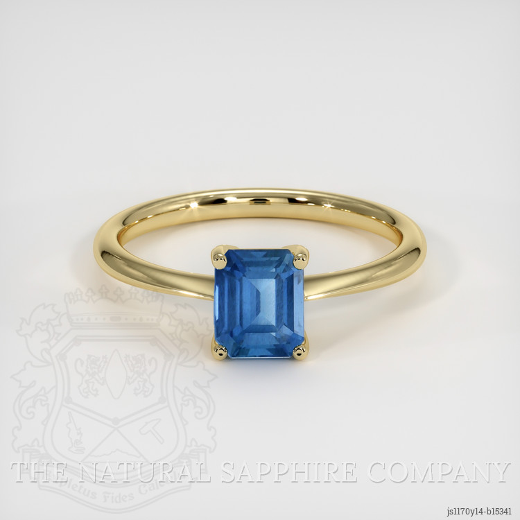 The ring features a beautiful, transparent 1.24 carat emerald cut shape blue sapphire with the dimensions of 6.51 x 5.33 x 3.72 mm and a emerald cut. It has a clarity grade of very slightly included (evaluated at eye level), medium intense color saturation, and an excellent polish. The origin of this sapphire is Ceylon (Sri Lanka).