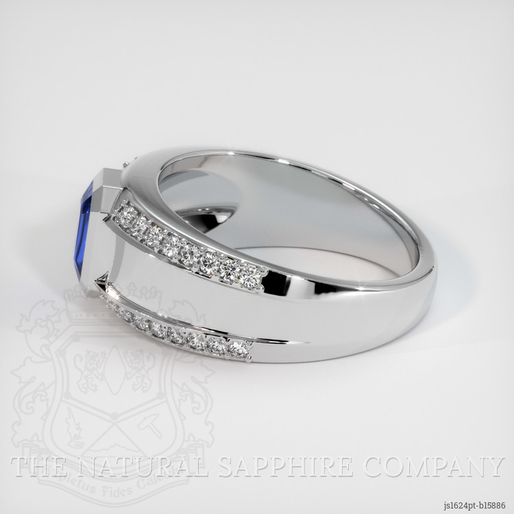 The men's ring features a beautiful, transparent 1.67 carat emerald cut shape blue sapphire with the dimensions of 7.78 x 5.61 x 3.73 mm and a emerald cut. It has a clarity grade of very slightly included (evaluated at eye level), vivid color saturation, and an excellent polish. The origin of this sapphire is Ceylon (Sri Lanka).