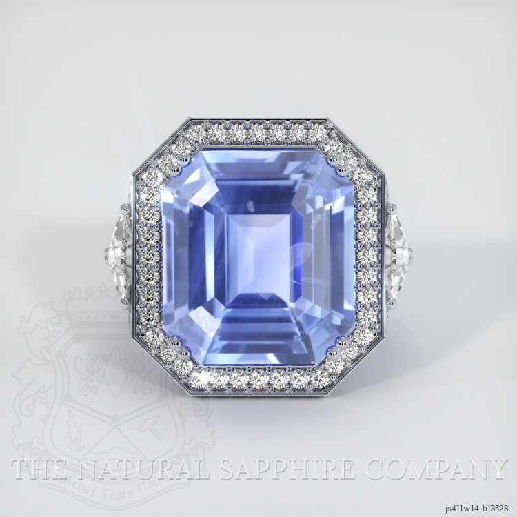 The ring features a beautiful, transparent GIA certified Blue 18.69 carat emerald cut shape blue sapphire with the dimensions of 16.26 x 14.64 x 8.21 mm and a emerald cut. It has a clarity grade of very slightly included (evaluated at eye level), medium color saturation, and an excellent polish. The origin of this sapphire is Ceylon (Sri Lanka).