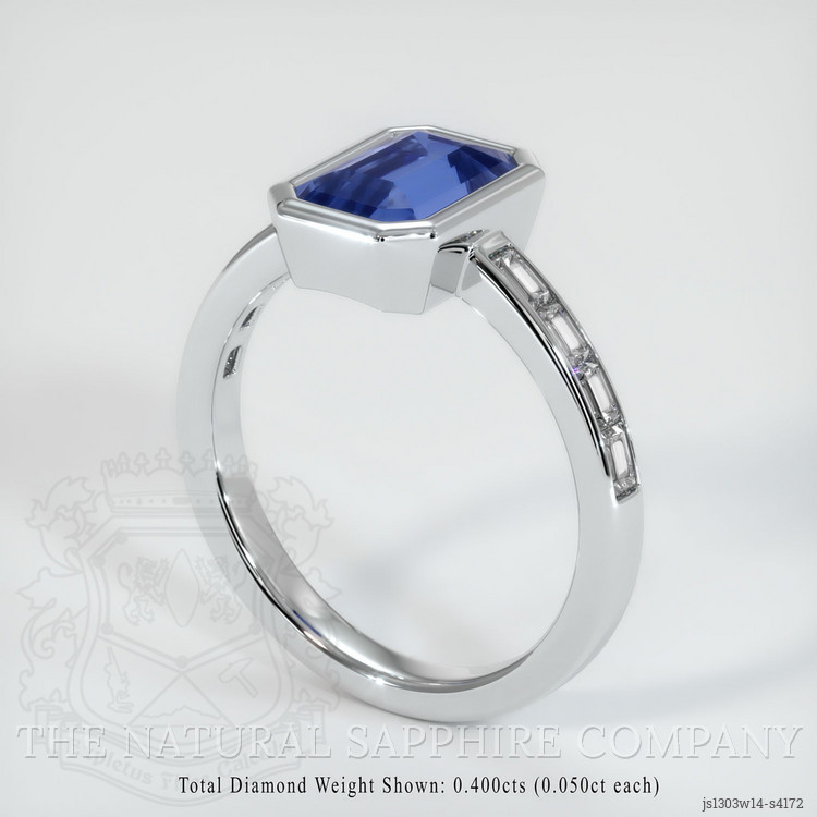 The ring features a beautiful, transparent 2.06 carat emerald cut shape blue sapphire with the dimensions of 8.37 x 5.83 x 4.03 mm and a emerald cut. It has a clarity grade of very slightly included (evaluated at eye level), intense color saturation, and an excellent polish. The origin of this sapphire is Madagascar.