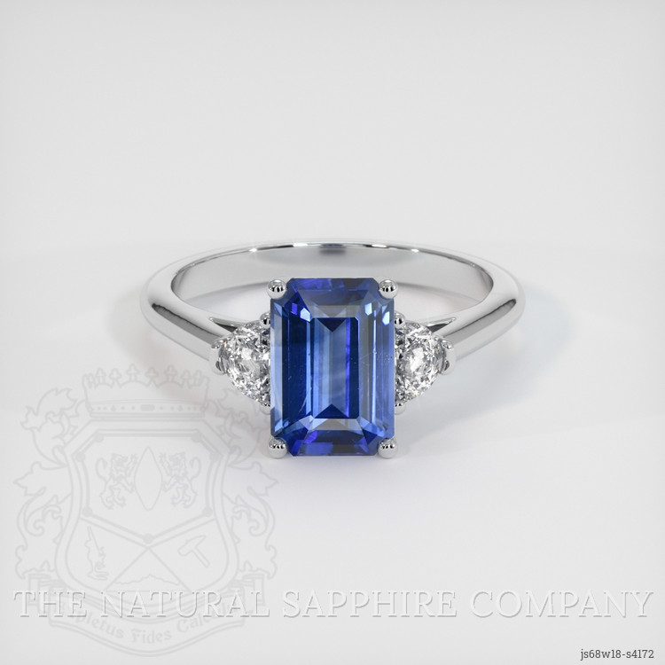 The ring features a beautiful, transparent 2.06 carat emerald cut shape blue sapphire with the dimensions of 8.37 x 5.83 x 4.03 mm and a emerald cut. It has a clarity grade of very slightly included (evaluated at eye level), intense color saturation, and an excellent polish. The origin of this sapphire is Madagascar.