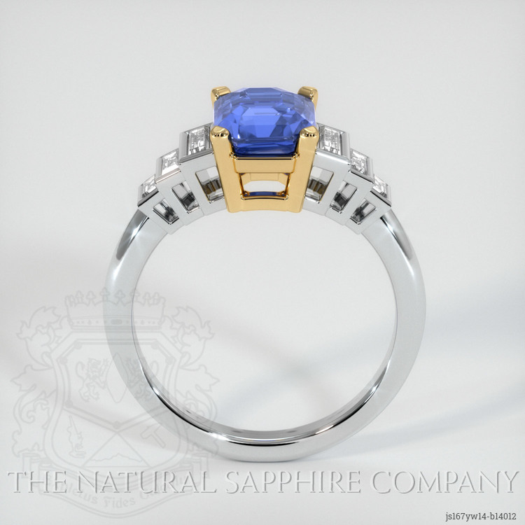 The ring features a beautiful, transparent GIA certified Blue 2.08 carat emerald cut shape blue sapphire with the dimensions of 7.42 x 6.30 x 4.78 mm and a emerald cut. It has a clarity grade of very slightly included (evaluated at eye level), intense color saturation, and an excellent polish. The origin of this sapphire is Ceylon (Sri Lanka).