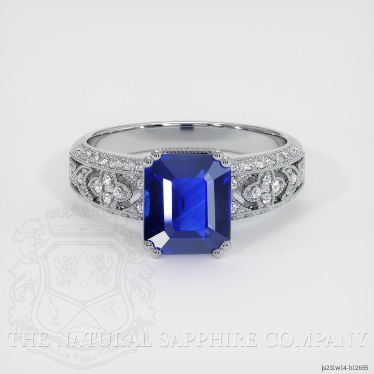 The ring features a beautiful, transparent 2.10 carat emerald cut shape blue sapphire with the dimensions of 7.67 x 6.67 x 4.14 mm and a emerald cut. It has a clarity grade of eye clean (evaluated at eye level), vivid color saturation, and an excellent polish. The origin of this sapphire is Ceylon (Sri Lanka).