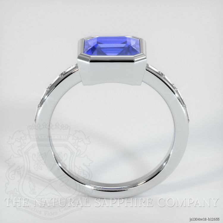 The ring features a beautiful, transparent 2.10 carat emerald cut shape blue sapphire with the dimensions of 7.67 x 6.67 x 4.14 mm and a emerald cut. It has a clarity grade of eye clean (evaluated at eye level), vivid color saturation, and an excellent polish. The origin of this sapphire is Ceylon (Sri Lanka).