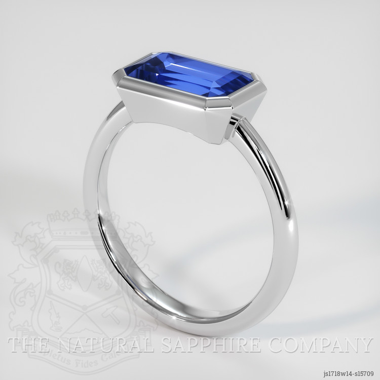 This men's ring from The Natural Sapphire Company pairs a refined emerald cut blue sapphire with a clean and contemporary 14K white gold band, creating a piece that reads both classic and modern. The sapphire weighs 2.57 carats and measures 10.04 x 6.38 x 3.77 mm, presenting an elongated emerald cut that emphasizes clarity and color. Evaluated at eye level, the stone is eye clean, with intense color saturation and an excellent polish that produces a vivid, lively blue. The sapphire hails from Ceylon, Sri Lanka, a source renowned for producing sapphires with luminous, velvety tones. The stone has undergone standard heat treatment to refine its color, a stable and accepted enhancement in fine colored gemstones, and the result is a deeply appealing blue that reads as natural and authentic on the hand.