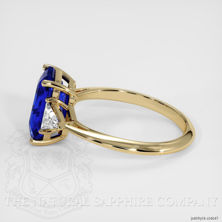 Complementing this majestic sapphire are white trillion diamonds, approximately 0.40 carats in total, with a VS1 to VS2 clarity and a pristine E color grade. These diamonds form the perfect companions, each facet catching the light to present an unparalleled dance of brilliance beside the deep blue centerpiece. The entire assembly rests within the warm embrace of 14K yellow gold, a metal celebrated for its timelessness and robustness, echoing the tradition, strength, and grace that The Natural Sapphire Company upholds in every masterpiece.
