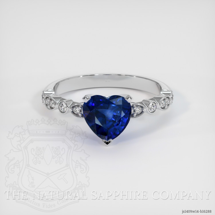 The ring features a beautiful, transparent 1.44 carat heart shape blue sapphire with the dimensions of 6.72 x 6.98 x 3.95 mm and a mixed brilliant cut. It has a clarity grade of very slightly included (evaluated at eye level), vivid color saturation, and an excellent polish. The origin of this sapphire is Ceylon (Sri Lanka).