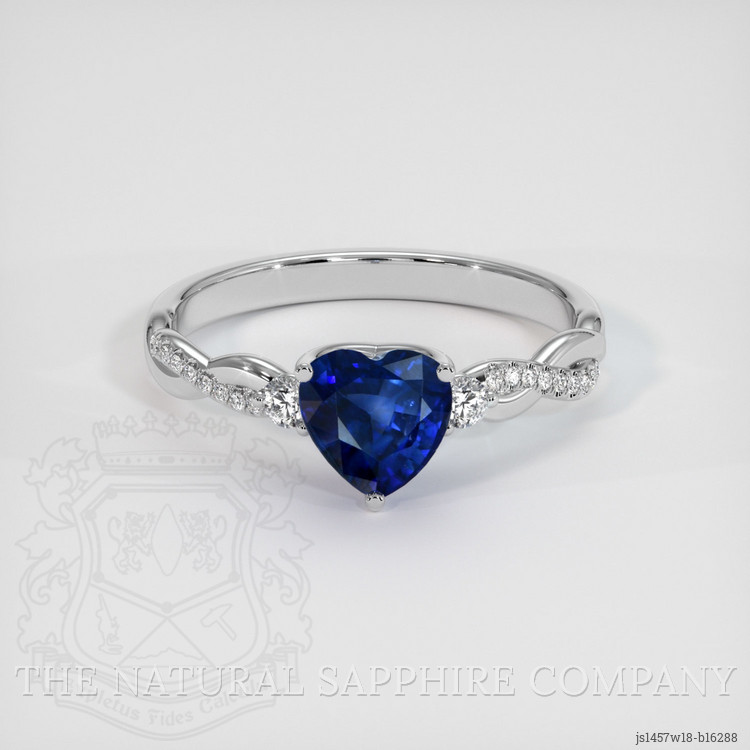 The ring features a beautiful, transparent 1.44 carat heart shape blue sapphire with the dimensions of 6.72 x 6.98 x 3.95 mm and a mixed brilliant cut. It has a clarity grade of very slightly included (evaluated at eye level), vivid color saturation, and an excellent polish. The origin of this sapphire is Ceylon (Sri Lanka).