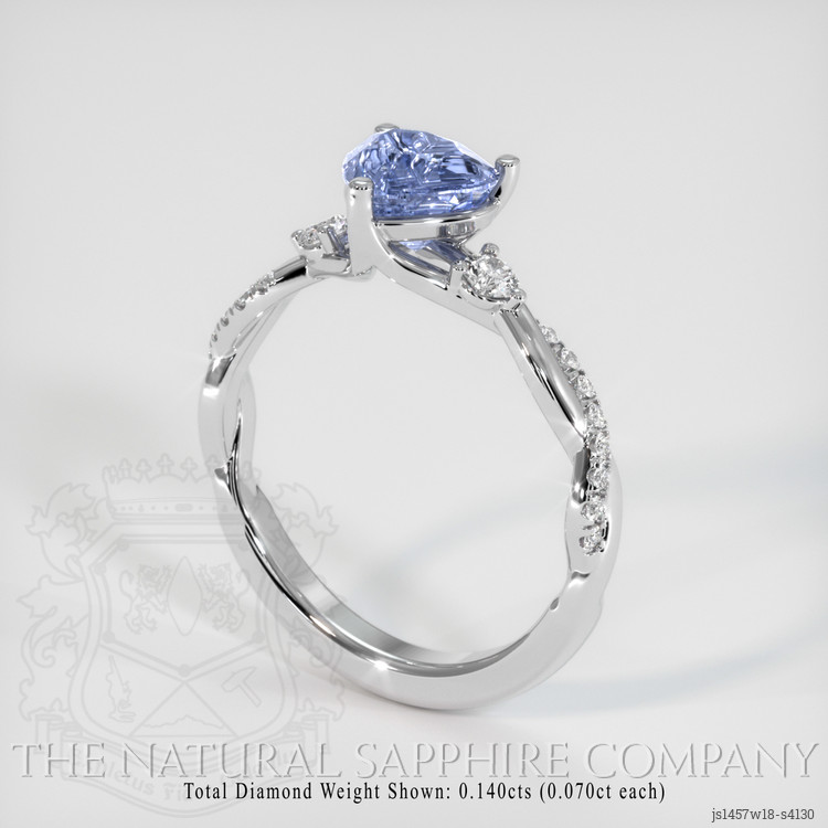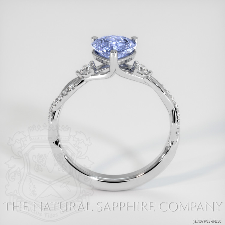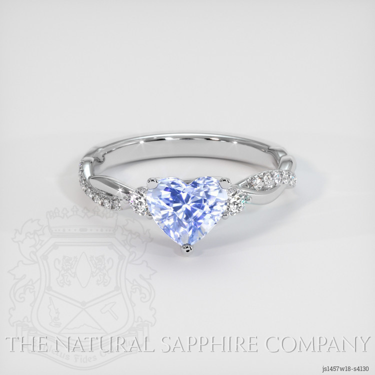The ring features a beautiful, transparent 1.63 carat heart shape blue sapphire with the dimensions of 6.37 x 7.33 x 5.06 mm and a mixed brilliant cut. It has a clarity grade of very slightly included (evaluated at eye level), medium light color saturation, and an excellent polish. The origin of this sapphire is Ceylon (Sri Lanka).