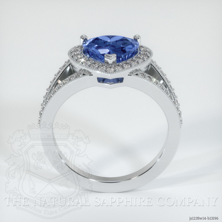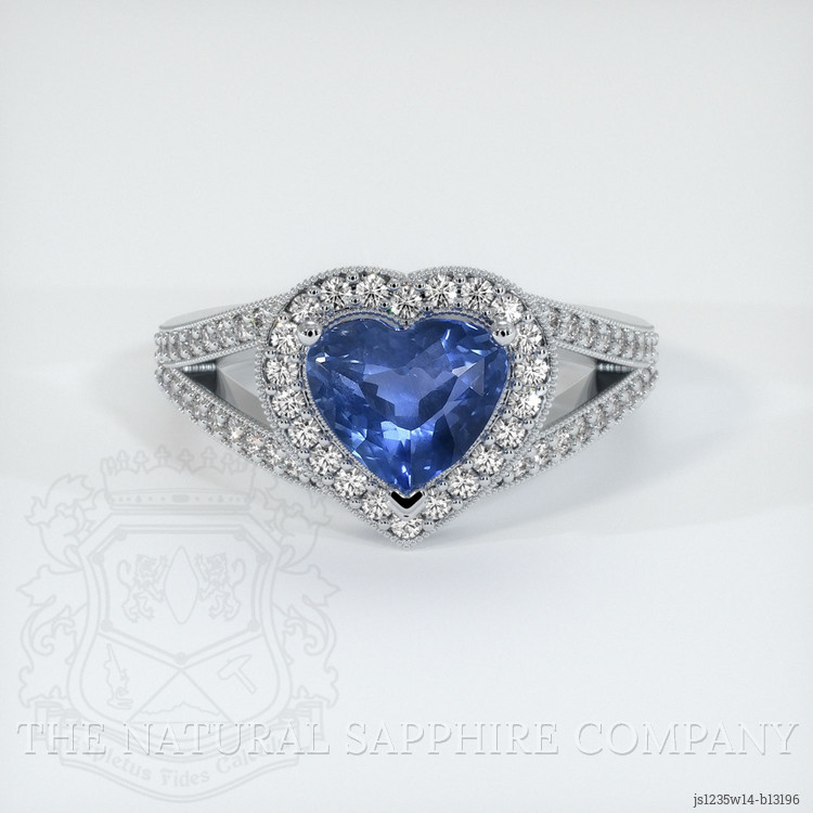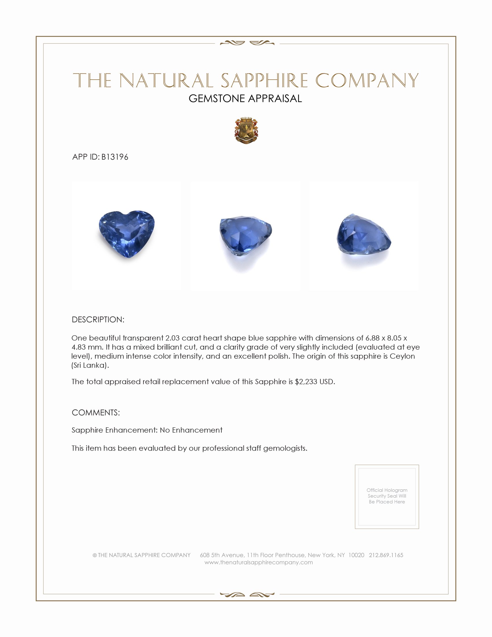 The ring features a beautiful, transparent 2.03 carat heart shape blue sapphire with the dimensions of 6.88 x 8.05 x 4.83 mm and a mixed brilliant cut. It has a clarity grade of eye clean (evaluated at eye level), medium intense color saturation, and an excellent polish. The origin of this sapphire is Ceylon (Sri Lanka).