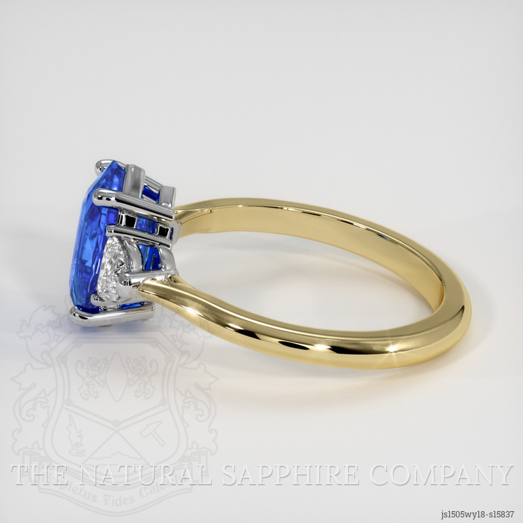 As this journey continues, the sapphire finds companionship with half-moon shaped diamonds that enhance its celestial beauty. These diamonds, weighing approximately 0.30 carats combined, possess a clarity of VS1 to VS2 and a prestigious color grade of E. Each diamond perfectly complements the sapphire’s vivid blue, providing a dance of lights that is both enthralling and elegant. Set in a blend of 18K white gold and 18K yellow gold, the ring is a testament to the timeless craftsmanship and design the Natural Sapphire Company is celebrated for. The contrast between the metals exudes a sense of balance, echoing the union of two individuals making a lifelong commitment.