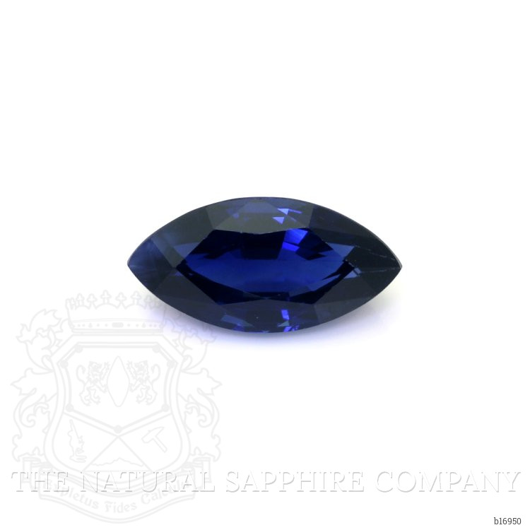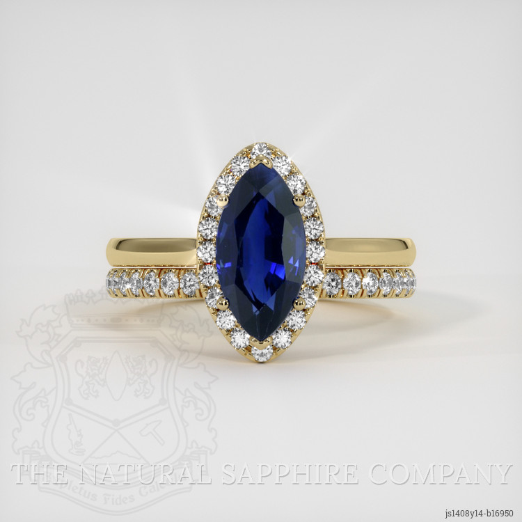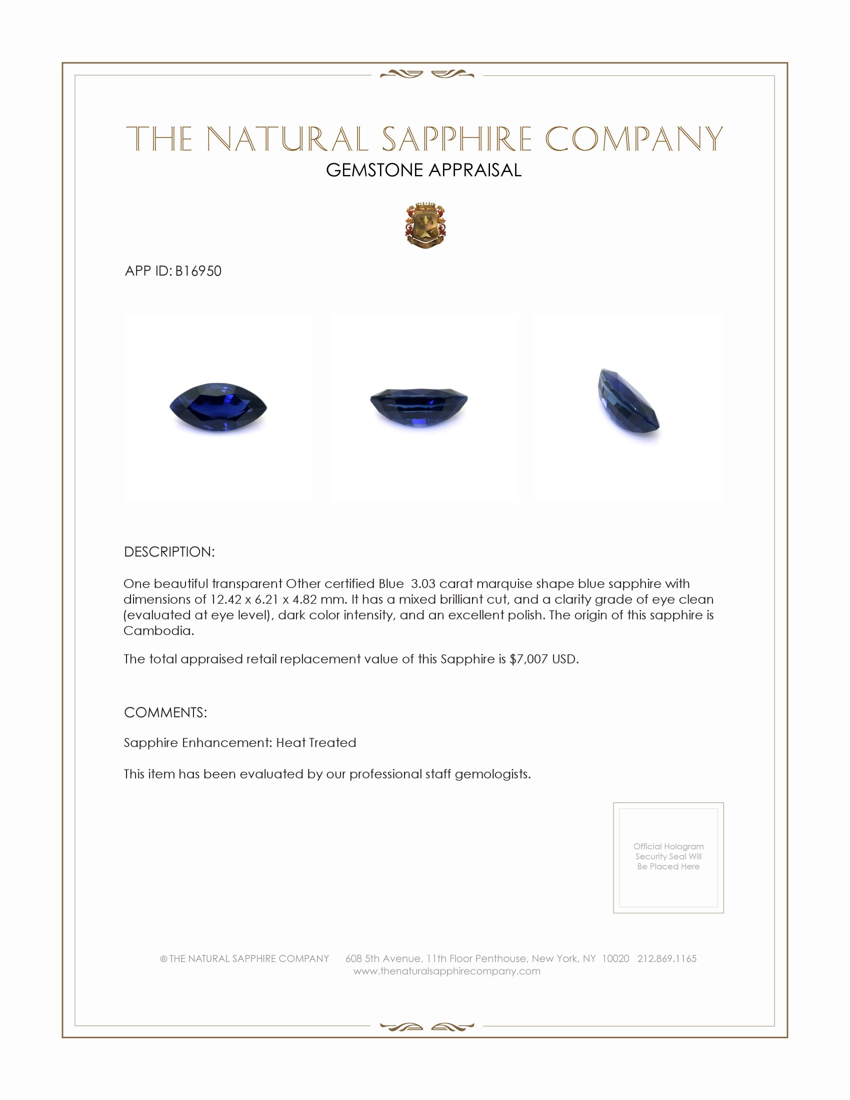 The ring features a beautiful, transparent Other certified Blue 3.03 carat marquise shape blue sapphire with the dimensions of 12.42 x 6.21 x 4.82 mm and a mixed brilliant cut. It has a clarity grade of eye clean (evaluated at eye level), dark color saturation, and an excellent polish. The origin of this sapphire is Cambodia.