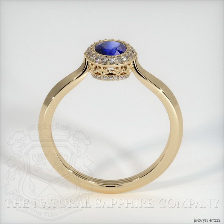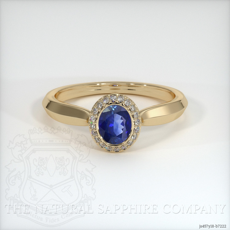 The ring features a beautiful, transparent 0.67 carat oval shape blue sapphire with the dimensions of 6.13 x 5.10 x 2.94 mm and a mixed brilliant cut. It has a clarity grade of very slightly included (evaluated at eye level), vivid color saturation, and an excellent polish. The origin of this sapphire is Ceylon (Sri Lanka).