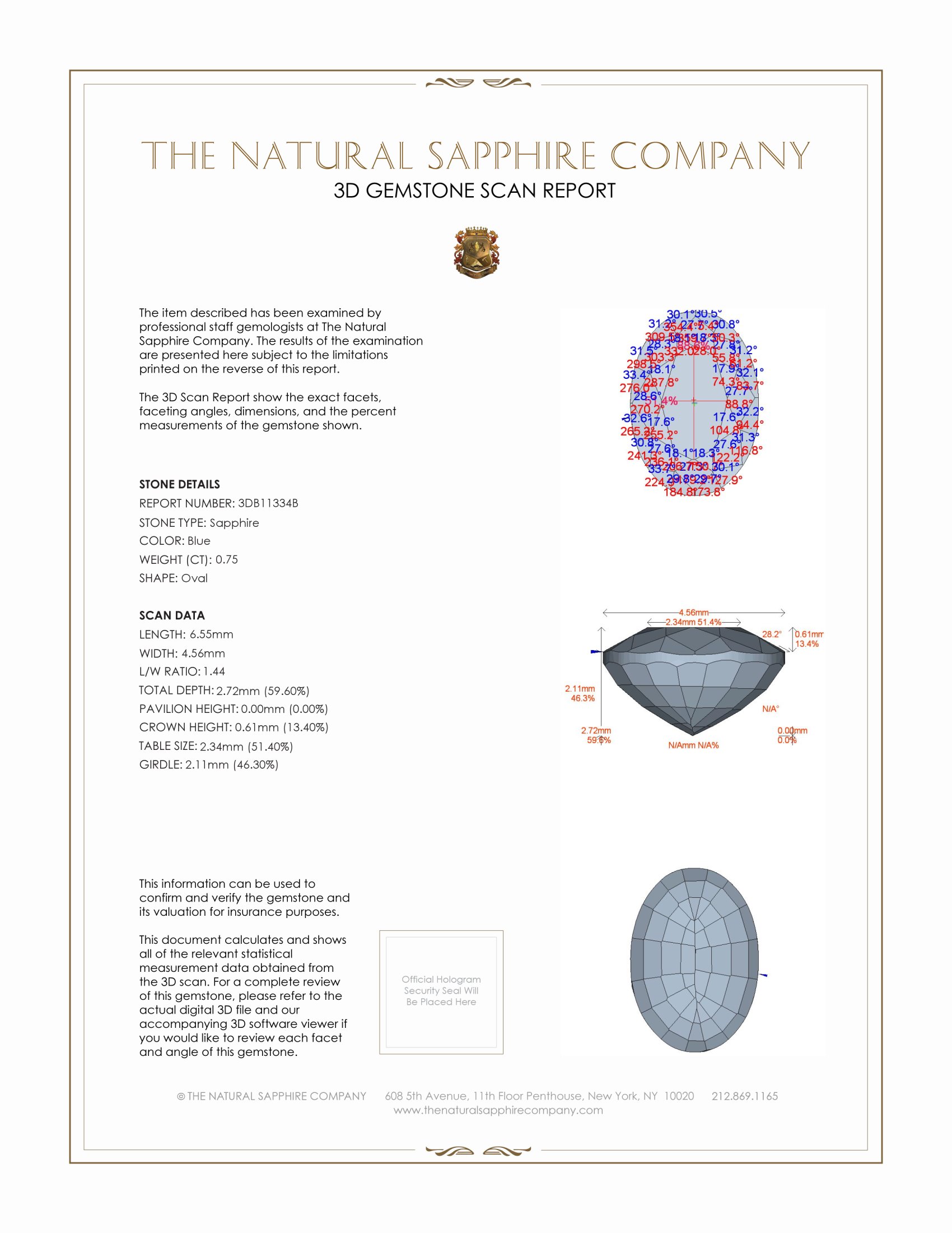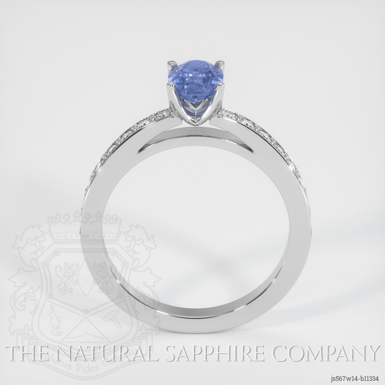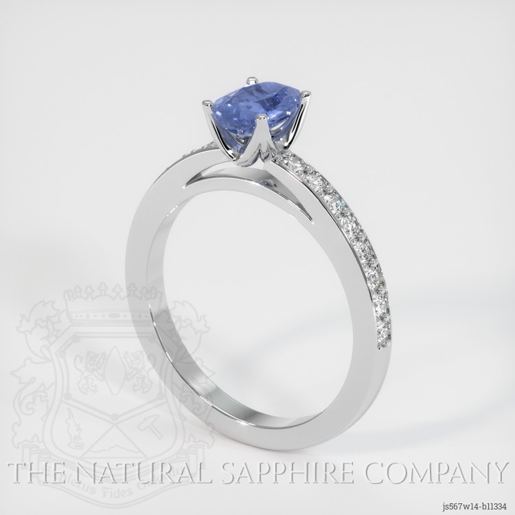 The ring features a beautiful, transparent 0.75 carat oval shape blue sapphire with the dimensions of 6.55 x 4.56 x 2.72 mm and a mixed brilliant cut. It has a clarity grade of very slightly included (evaluated at eye level), medium intense color saturation, and an excellent polish. The origin of this sapphire is Ceylon (Sri Lanka).