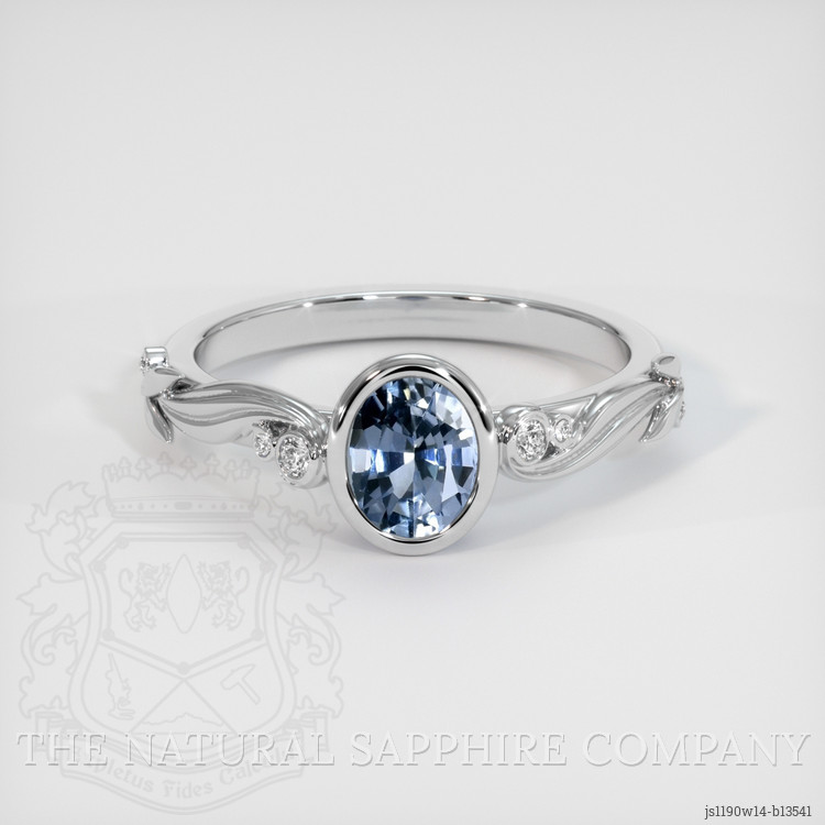 The ring features a beautiful, transparent 0.78 carat oval shape blue sapphire with the dimensions of 6.17 x 4.76 x 3.34 mm and a mixed brilliant cut. It has a clarity grade of eye clean (evaluated at eye level), medium color saturation, and an excellent polish. The origin of this sapphire is Ceylon (Sri Lanka).