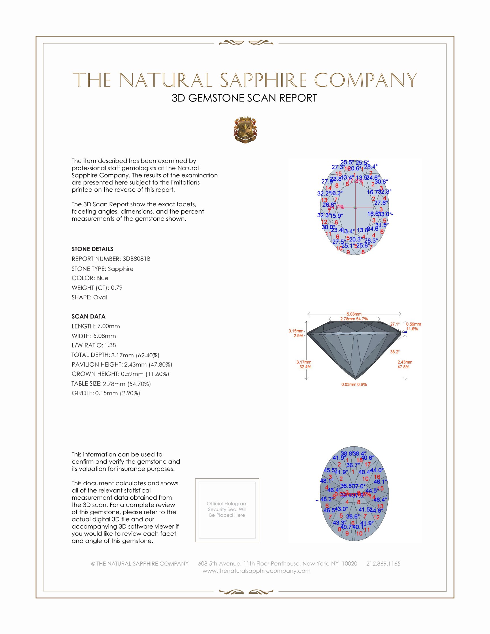 The ring features a beautiful, transparent 0.79 carat oval shape blue sapphire with the dimensions of 7.00 x 5.08 x 3.17 mm and a mixed brilliant cut. It has a clarity grade of slightly included (evaluated at eye level), intense color saturation, and an excellent polish. The origin of this sapphire is Montana.