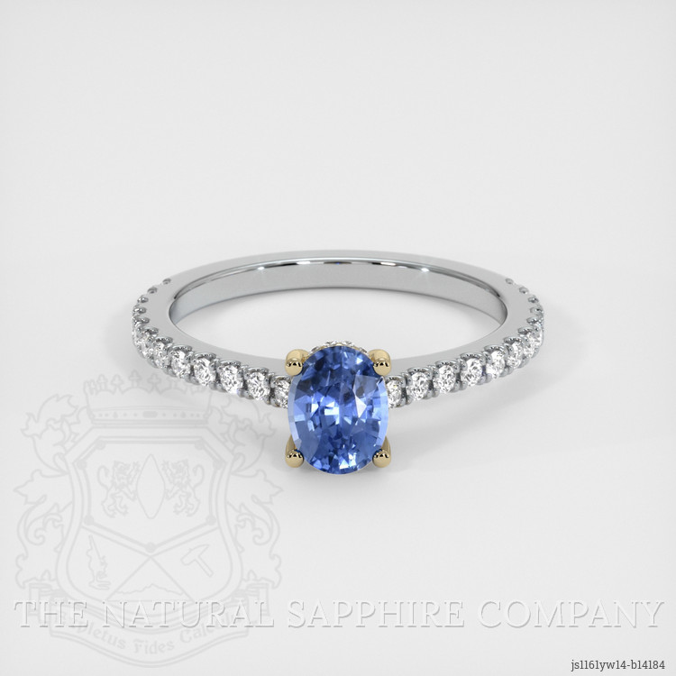 The ring features a beautiful, transparent 0.82 carat oval shape blue sapphire with the dimensions of 6.04 x 4.75 x 3.62 mm and a mixed brilliant cut. It has a clarity grade of very slightly included (evaluated at eye level), intense color saturation, and an excellent polish. The origin of this sapphire is Ceylon(Sri Lanka).