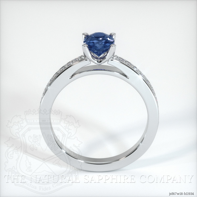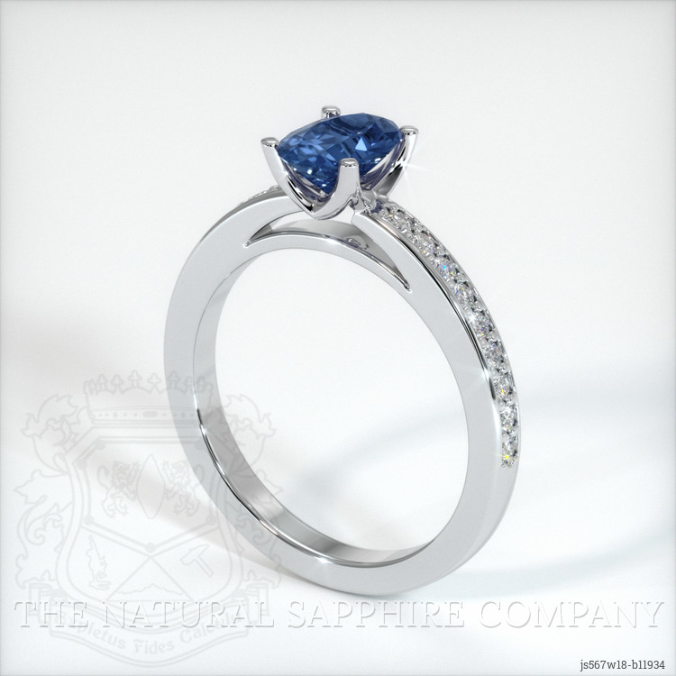 The ring features a beautiful, transparent GIA certified Blue 0.97 carat oval shape blue sapphire with the dimensions of 6.92 x 4.91 x 3.28 mm and a brilliant cut. It has a clarity grade of very slightly included (evaluated at eye level), intense color saturation, and an excellent polish. The origin of this sapphire is Ceylon (Sri Lanka).