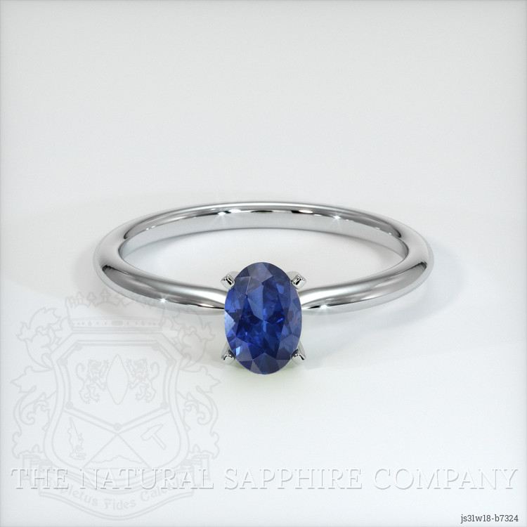 The ring features a beautiful, transparent 0.98 carat oval shape blue sapphire with the dimensions of 7.53 x 5.19 x 3.41 mm and a mixed brilliant cut. It has a clarity grade of very slightly included (evaluated at eye level), intense color saturation, and an excellent polish. The origin of this sapphire is Thailand.