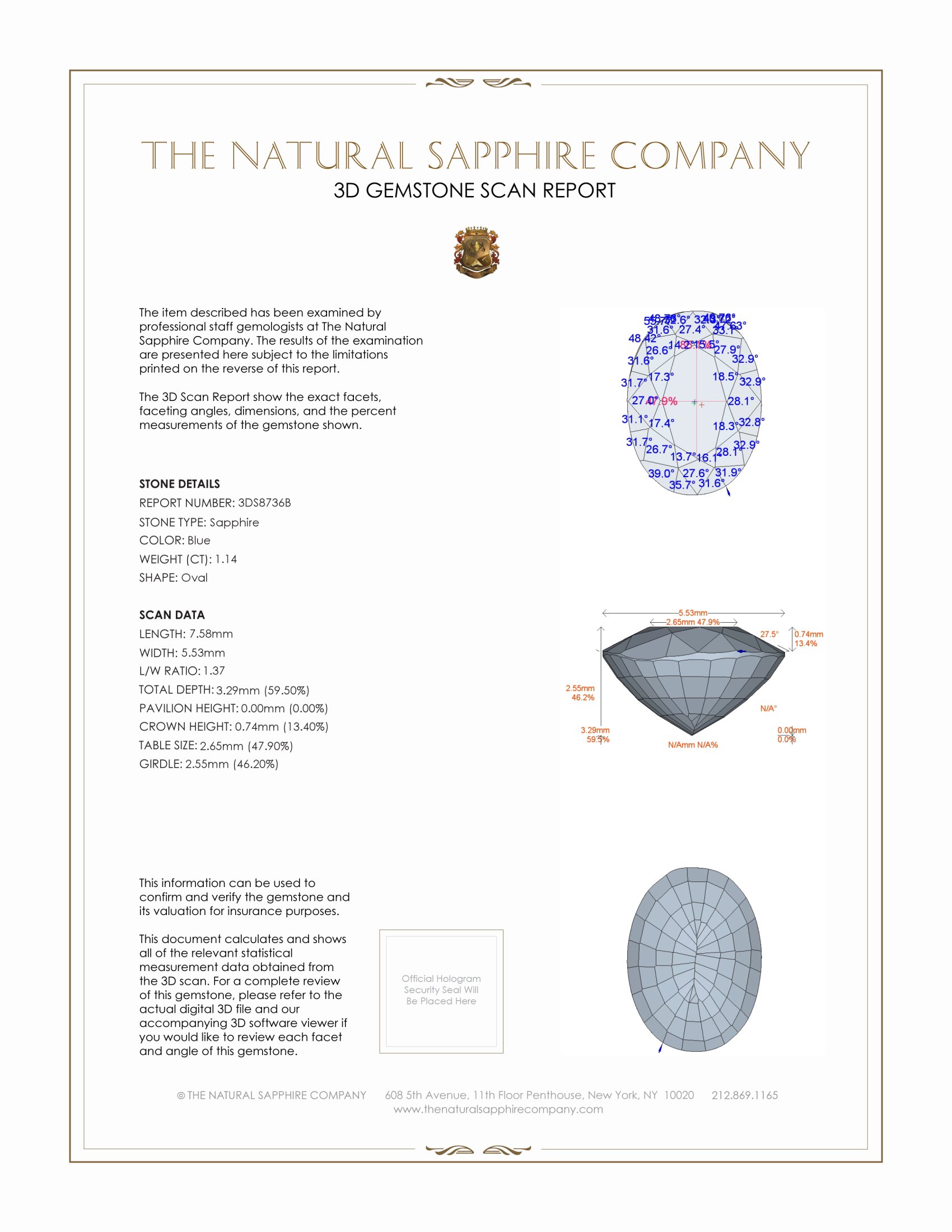 Deep in the lush landscapes of Ceylon, now known as Sri Lanka, where endless green meets an enchanting sky-blue horizon, our journey begins. It is here, amidst nature’s finest wonders, that our exquisite 1.14 carat sapphire was unearthed. This gem, a beacon of nature’s artistry, boasts a captivating oval shape with dimensions of 7.58 x 5.53 x 3.29 mm. Cut with a mixed brilliant style, each angle reveals unparalleled clarity of very slight inclusions, a hallmark of its authenticity. With every glance, you’re greeted by vivid color saturation, a mesmerizing deep blue that seems to hold the essence of the ocean itself. As light dances upon its surface, its polished finish perfectly captures the gem’s eternal elegance and splendor.