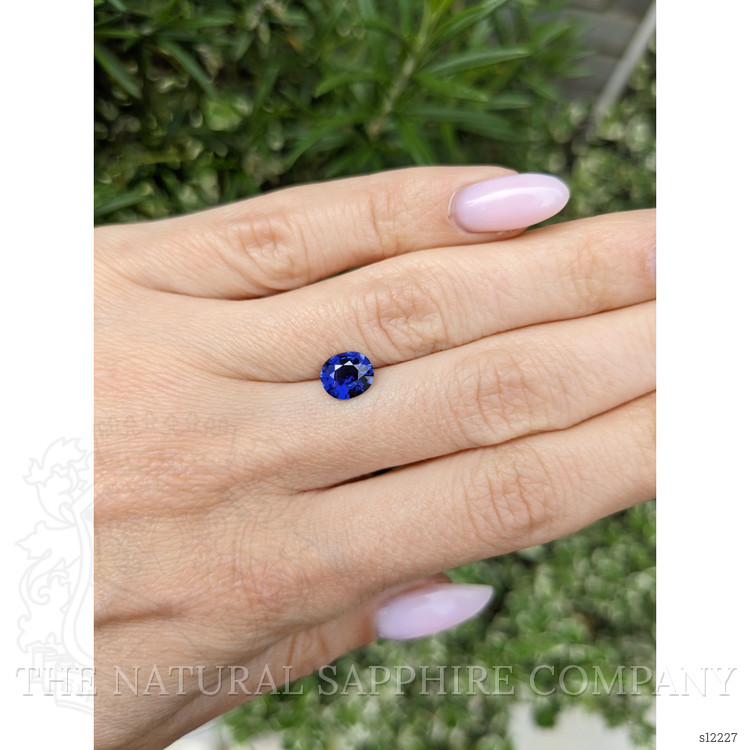 The ring features a beautiful, transparent 1.30 carat oval shape blue sapphire with the dimensions of 7.37 x 6.37 x 3.64 mm and a mixed brilliant cut. It has a clarity grade of eye clean (evaluated at eye level), vivid color saturation, and an excellent polish. The origin of this sapphire is Thailand.