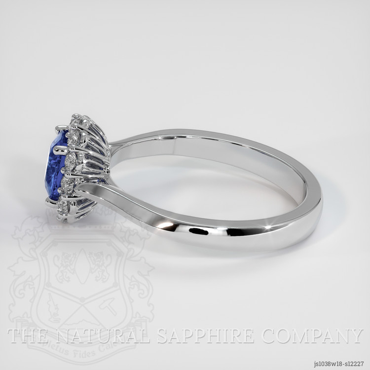 The ring features a beautiful, transparent 1.30 carat oval shape blue sapphire with the dimensions of 7.37 x 6.37 x 3.64 mm and a mixed brilliant cut. It has a clarity grade of eye clean (evaluated at eye level), vivid color saturation, and an excellent polish. The origin of this sapphire is Thailand.