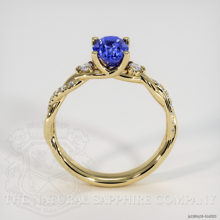 Adding to the ring's captivating design are the accompanying white round-shaped natural diamonds, weighing approximately 0.18 carats in total. With a clarity range of VS1 to VS2 and color grades of F to G, these diamonds are not only pristine but match the highest standards of quality. The brilliance of these diamonds, paired with the sapphire, results in a harmonious blend of colors and light. When set against the luxurious backdrop of 18K yellow gold, the overall composition illustrates a fusion of classic elegance and modern sophistication, a feature that allows this ring to surpass others available on the market.