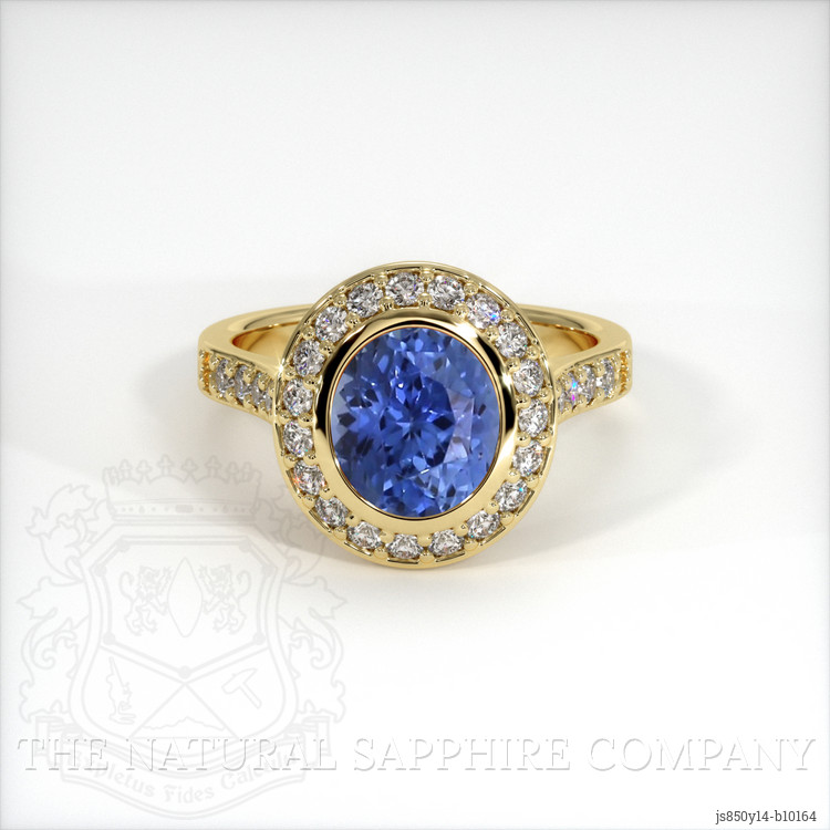 The ring features a beautiful, transparent 1.75 carat oval shape blue sapphire with the dimensions of 7.53 x 6.56 x 4.61 mm and a modified brilliant cut. It has a clarity grade of very slightly included (evaluated at eye level), intense color saturation, and an excellent polish. The origin of this sapphire is Ceylon (Sri Lanka).