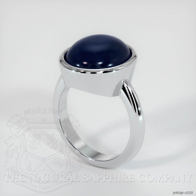 The men's ring features a beautiful, semi-translucent 11.64 carat oval shape blue sapphire with the dimensions of 13.89 x 11.93 x 7.19 mm and a double cabochon cut. It has a clarity grade of slightly included (evaluated at eye level), vivid color saturation, and an excellent polish. The origin of this sapphire is Ceylon (Sri Lanka).