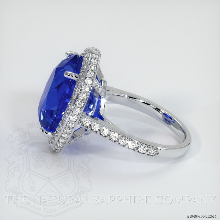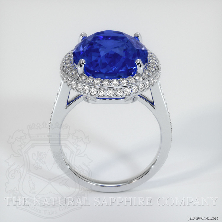 The ring features a beautiful, transparent C.Dunaigre certified Vivid Blue “Royal Blue” 13.50 carat oval shape blue sapphire with the dimensions of 15.46 x 12.11 x 8.78 mm and a mixed brilliant cut. It has a clarity grade of eye clean (evaluated at eye level), vivid color saturation, and an excellent polish. The origin of this sapphire is Ceylon (Sri Lanka).