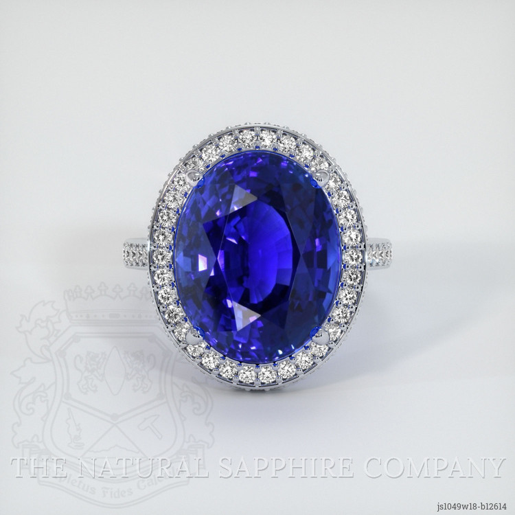 The ring features a beautiful, transparent C.Dunaigre certified Vivid Blue “Royal Blue” 13.50 carat oval shape blue sapphire with the dimensions of 15.46 x 12.11 x 8.78 mm and a mixed brilliant cut. It has a clarity grade of eye clean (evaluated at eye level), vivid color saturation, and an excellent polish. The origin of this sapphire is Ceylon (Sri Lanka).