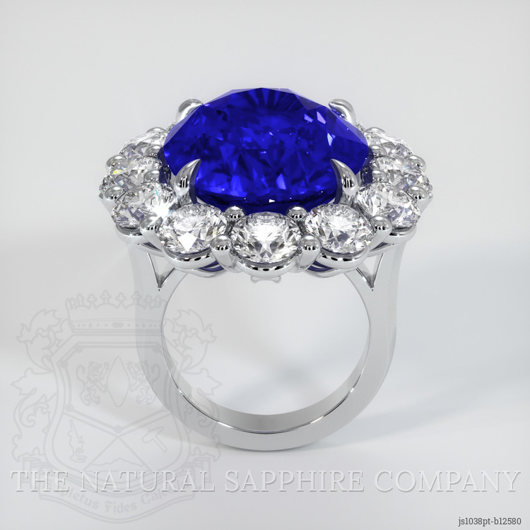 The ring features a beautiful, transparent C.Dunaigre certified Vivid Blue 15.67 carat oval shape blue sapphire with the dimensions of 16.41 x 13.71 x 8.61 mm and a mixed brilliant cut. It has a clarity grade of eye clean (evaluated at eye level), vivid color saturation, and an excellent polish. The origin of this sapphire is Ceylon (Sri Lanka).