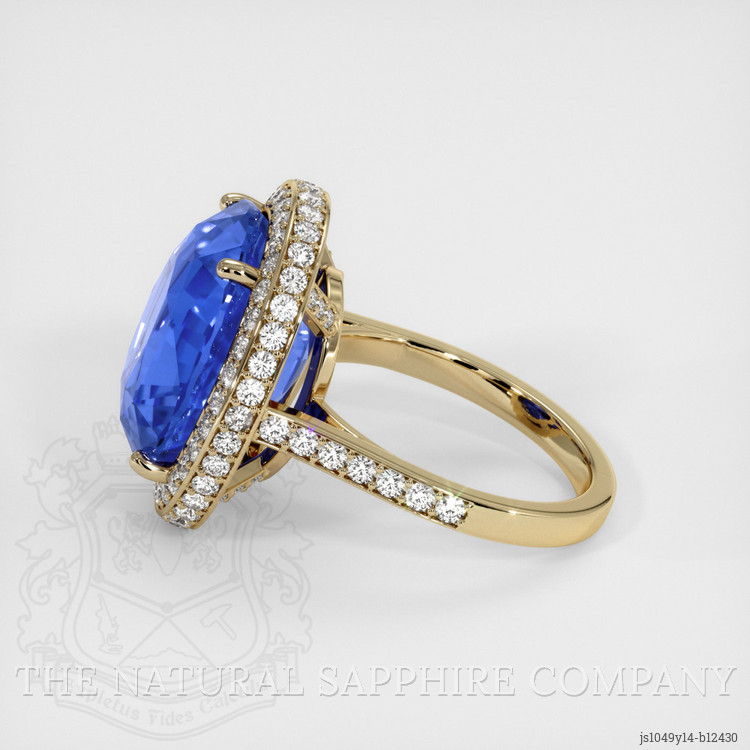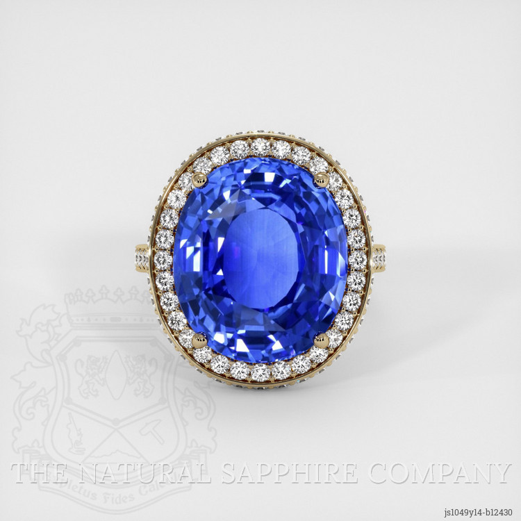 The ring features a beautiful, transparent GIA certified Blue 16.75 carat oval shape blue sapphire with the dimensions of 15.69 x 13.33 x 8.80 mm and a mixed brilliant cut. It has a clarity grade of eye clean (evaluated at eye level), intense color saturation, and an excellent polish. The origin of this sapphire is Ceylon (Sri Lanka).