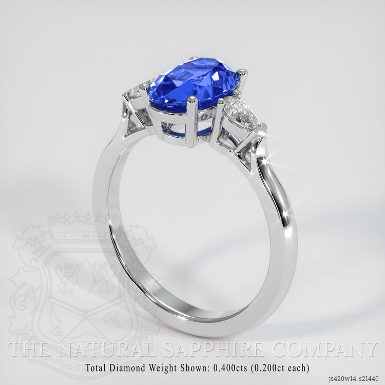 Adding further grandeur are the white pear-shaped natural diamonds that effortlessly complement the sapphire at the center. Weighing approximately 0.40 carats, these diamonds are graded as Very Slightly Included (VS1, VS2) in clarity, with an exceptional E color grade, implying near-colorless, high-quality diamonds. Their pristine quality reinforces the ring’s luxurious appeal, providing an elegant contrast against the rich blue sapphire. The clarity and color of the diamonds exude brilliance, ensuring that the gemstones do not only look magnificent on their own but also elevate each other’s beauty, creating an ensemble that is simply breathtaking.