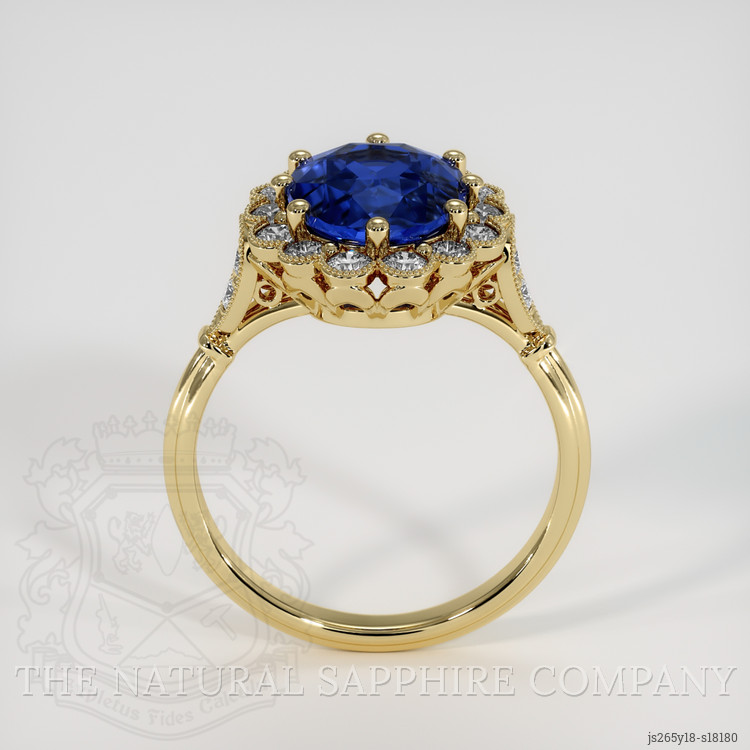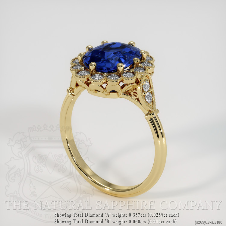 The surrounding diamonds and the mounting are where expert craftsmanship elevates the sapphire into a true heirloom piece, and where we distinguish our work from cheaper, machine made settings that compromise the gem s presence. The halo and accents feature finely matched, white round natural diamonds, with the principal halo and shoulder accents weighing approximately 0.357 carats, and additional accent diamonds totaling approximately 0.06 carats, each graded Very Slightly Included in clarity with VS1 and VS2 designations and an F color grade. Those characteristics give exceptional contrast and sparkle, while remaining clean to the eye, so the diamonds enhance the sapphire without distracting from its vivid hue. The ring is expertly hand set in 18K yellow gold, a choice that complements the deep blue with warm undertones and that offers superior longevity compared with lower karat alloys or plated metals. Our bench work shows in the secure prong settings, the precisely calibrated halo that maximizes light reaching the sapphire, and the open gallery that allows light to enter from below, all of which increase perceived size and brilliance more effectively than flush or heavy bezel mounts commonly found on lower quality pieces.