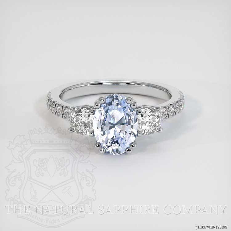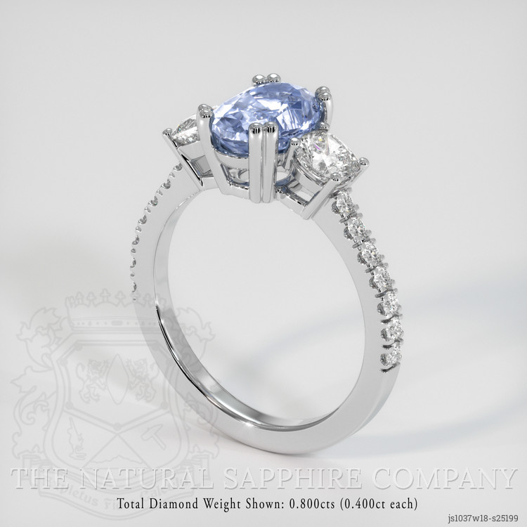 Surrounding the centre sapphire are white cushion shaped natural diamonds weighing approximately 0.80 carats, with clarity grades of VS1 and VS2 and a rare E colour, These larger side diamonds are paired with white round shaped natural diamonds totaling approximately 0.40 carats, with VS clarity and an F to G colour range, The diamonds are set in platinum 950 which offers both durability and a cool white backdrop that enhances the icy beauty of the diamonds and the soft blue of the sapphire, The three stone arrangement and the graduated shoulder of pavé set rounds are evocative of the salon jewels of the Belle Epoque and the elegant three stone settings popular in the late 19th and early 20th centuries, The robust platinum four prong setting that secures the oval recalls the structural grace of museum pieces, while the delicate cushion and round side stones echo the ornamental balance of antique cluster rings, This ring is crafted to be heirloom ready, a piece that feels at home among historical treasures, and yet entirely suited for modern wear, It invites a wearer to continue the story of a gemstone that has crossed continents and centuries, offered by The Natural Sapphire Company as a lasting emblem of tradition and refined taste.