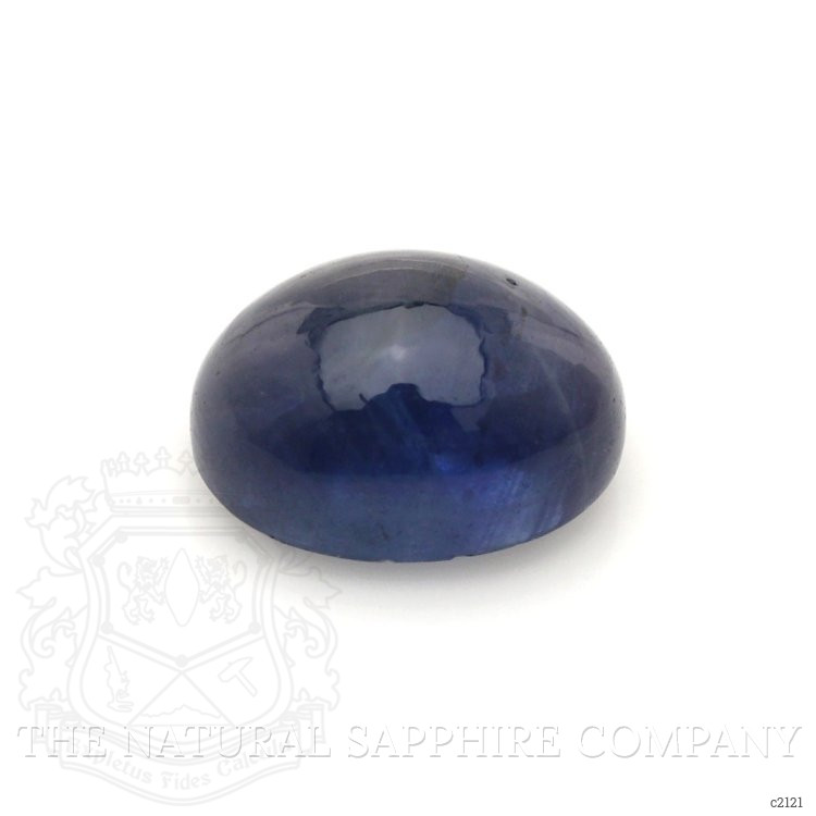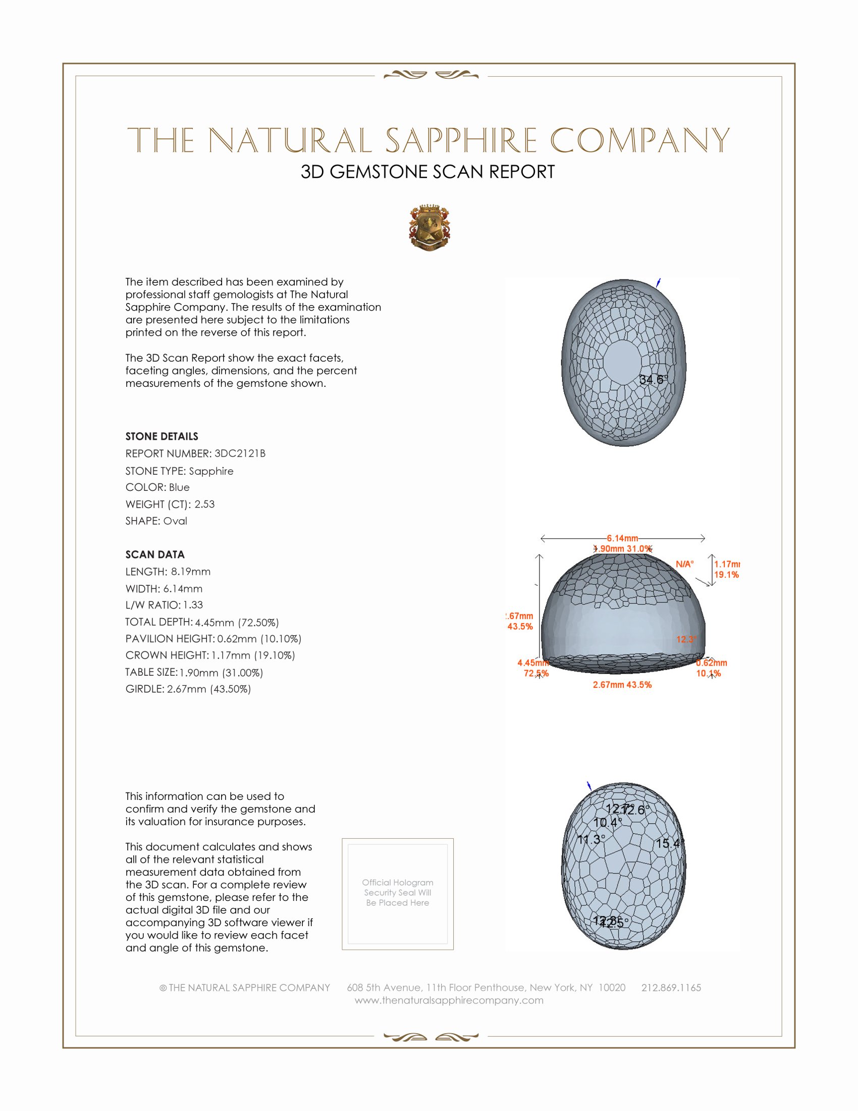 The ring features a beautiful, semi-translucent 2.53 carat oval shape blue sapphire with the dimensions of 8.19 x 6.14 x 4.45 mm and a cabochon cut. It has a clarity grade of eye clean (evaluated at eye level), vivid color saturation, and an excellent polish. The origin of this sapphire is Ceylon (Sri Lanka).