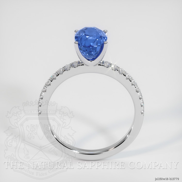 The ring features a beautiful, transparent 2.55 carat oval shape blue sapphire with the dimensions of 8.73 x 6.18 x 5.18 mm and a mixed brilliant cut. It has a clarity grade of very slightly included (evaluated at eye level), intense color saturation, and an excellent polish. The origin of this sapphire is Ceylon (Sri Lanka).