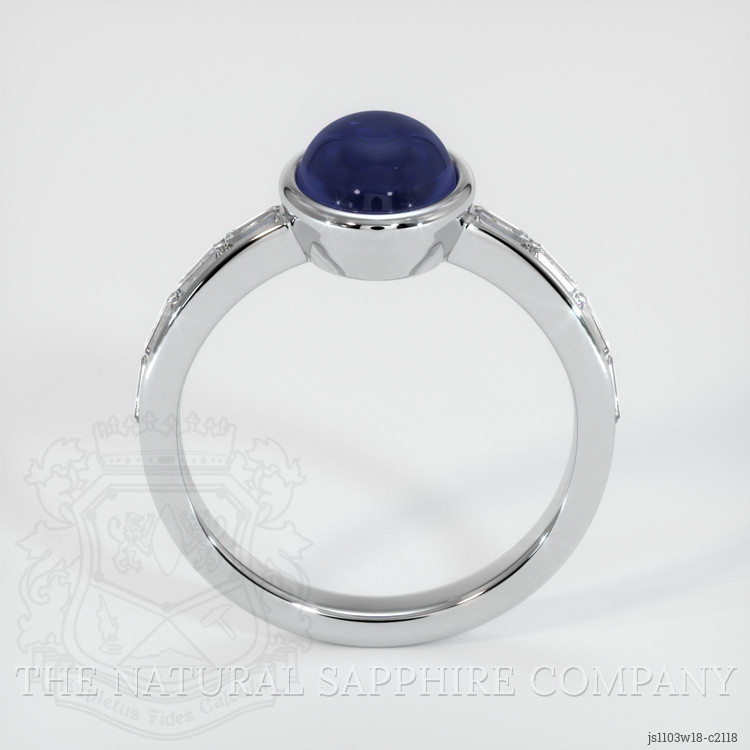 The ring features a beautiful, semi-translucent 2.91 carat oval shape blue sapphire with the dimensions of 8.57 x 7.02 x 4.84 mm and a cabochon cut. It has a clarity grade of very slightly included (evaluated at eye level), vivid color saturation, and an excellent polish. The origin of this sapphire is Ceylon(Sri Lanka).