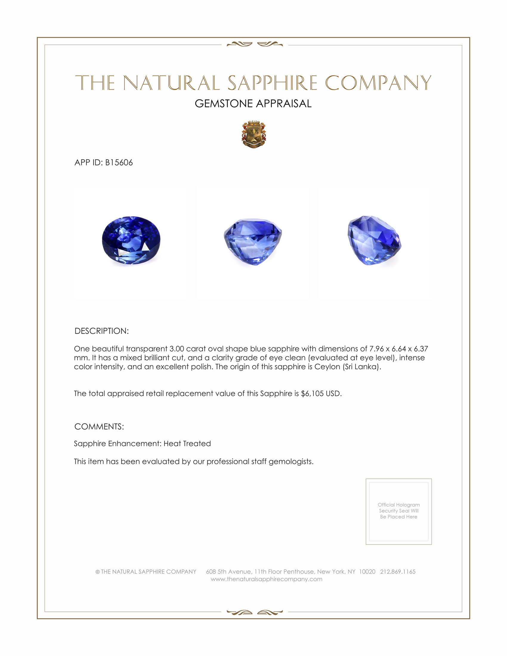 The ring features a beautiful, transparent 3.00 carat oval shape blue sapphire with the dimensions of 7.96 x 6.64 x 6.37 mm and a mixed brilliant cut. It has a clarity grade of eye clean (evaluated at eye level), intense color saturation, and an excellent polish. The origin of this sapphire is Ceylon (Sri Lanka).