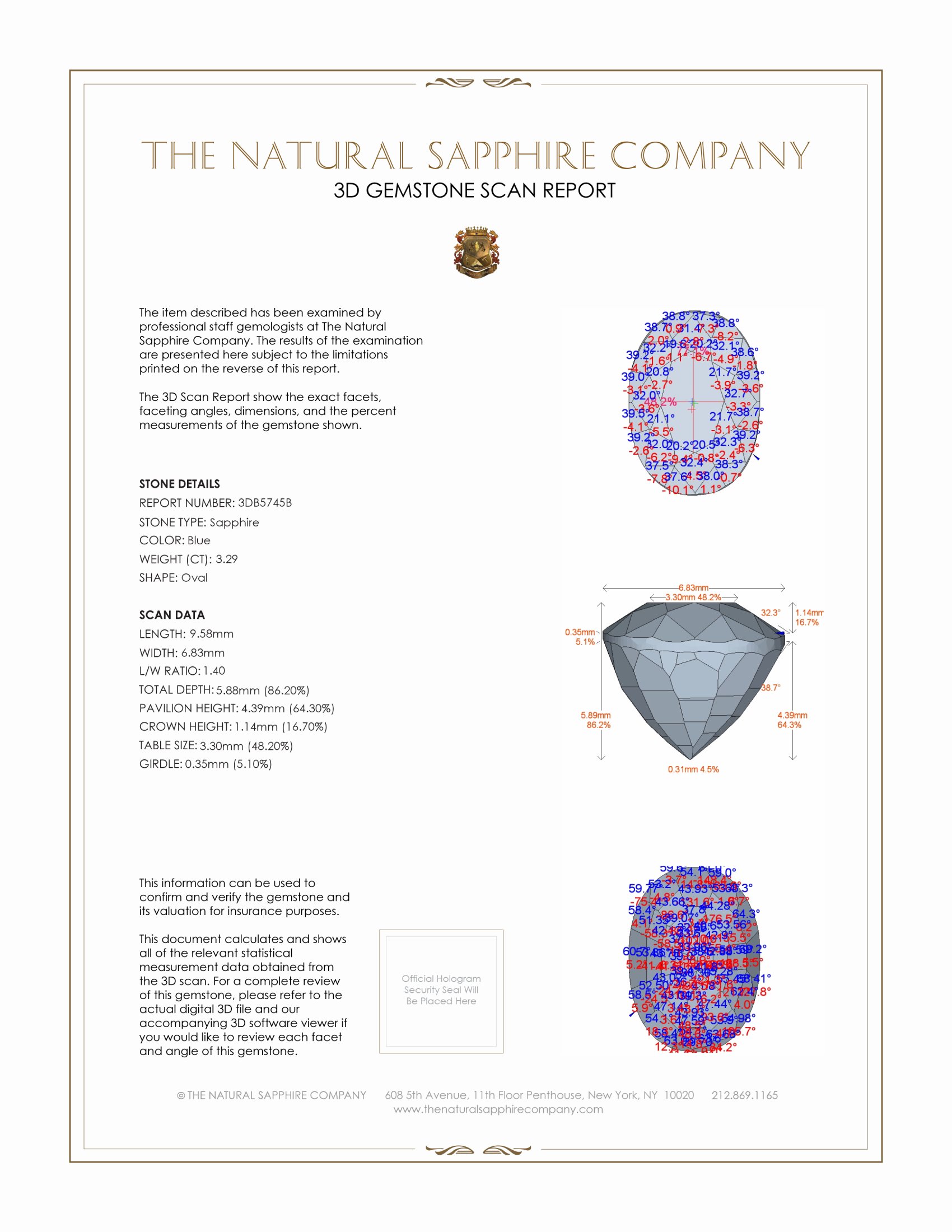 The ring features a beautiful, transparent AGL certified Blue 3.29 carat oval shape blue sapphire with the dimensions of 9.58 x 6.83 x 5.88 mm and a mixed brilliant cut. It has a clarity grade of very slightly included (evaluated at eye level), vivid color saturation, and an excellent polish. The origin of this sapphire is Madagascar.