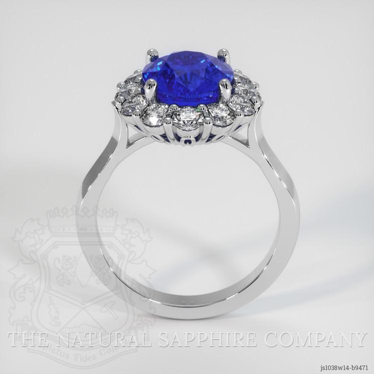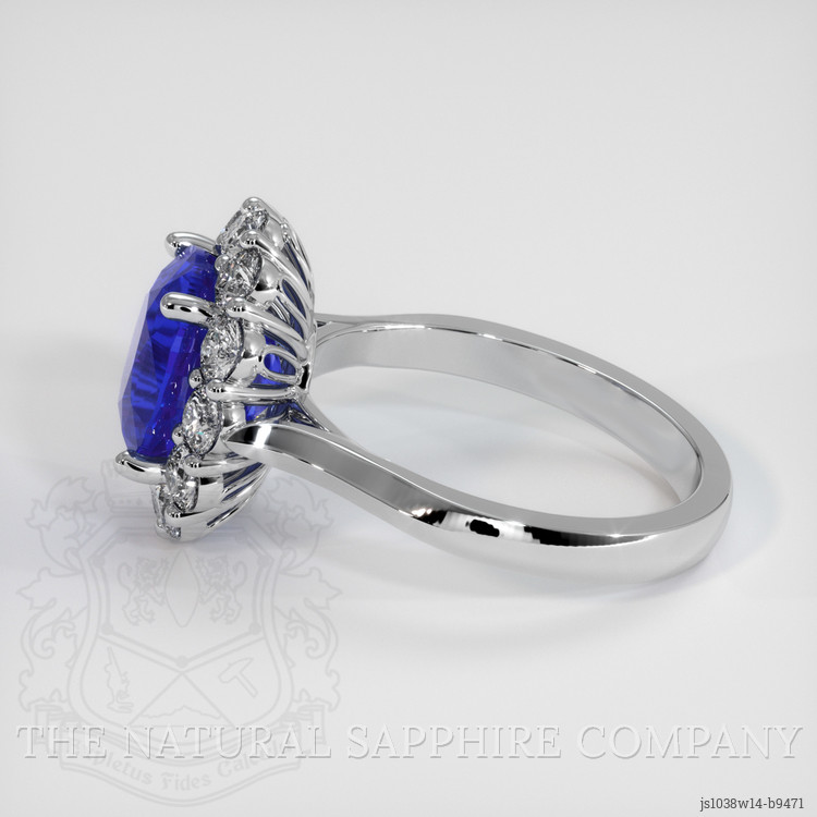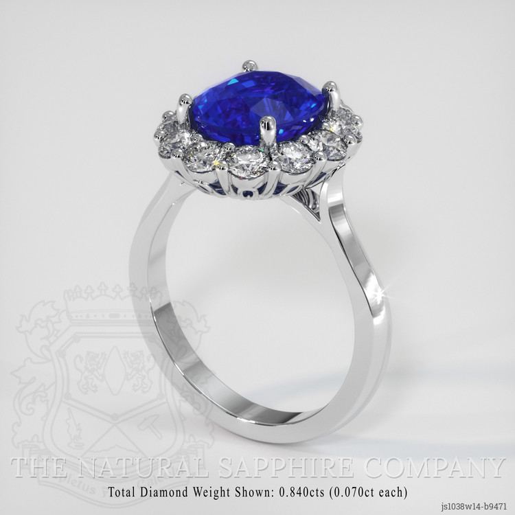 The ring features a beautiful, transparent C.Dunaigre certified Vivid Blue “Royal Blue” 3.53 carat oval shape blue sapphire with the dimensions of 9.08 x 7.96 x 5.95 mm and a mixed brilliant cut. It has a clarity grade of eye clean (evaluated at eye level), vivid color saturation, and an excellent polish. The origin of this sapphire is Ceylon (Sri Lanka).