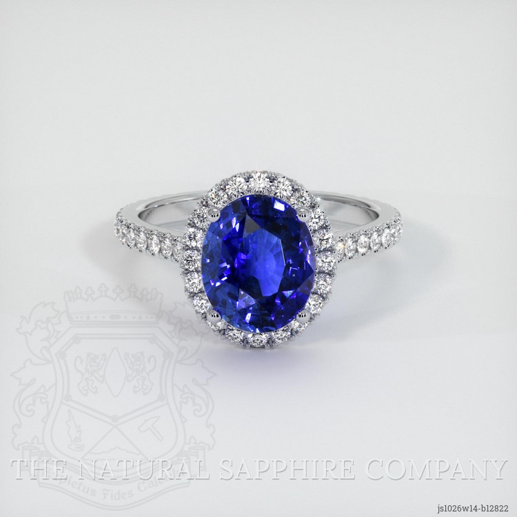 The ring features a beautiful, transparent GRS certified Vivid Blue “Royal Blue” 4.05 carat oval shape blue sapphire with the dimensions of 9.70 x 8.02 x 5.97 mm and a mixed brilliant cut. It has a clarity grade of very slightly included (evaluated at eye level), vivid color saturation, and an excellent polish. The origin of this sapphire is Madagascar.