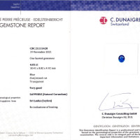 The ring features a beautiful, transparent C.Dunaigre certified Blue 4.05 carat oval shape blue sapphire with the dimensions of 10.43 x 8.83 x 4.94 mm and a mixed brilliant cut. It has a clarity grade of eye clean (evaluated at eye level), medium intense color saturation, and an excellent polish. The origin of this sapphire is Ceylon (Sri Lanka).