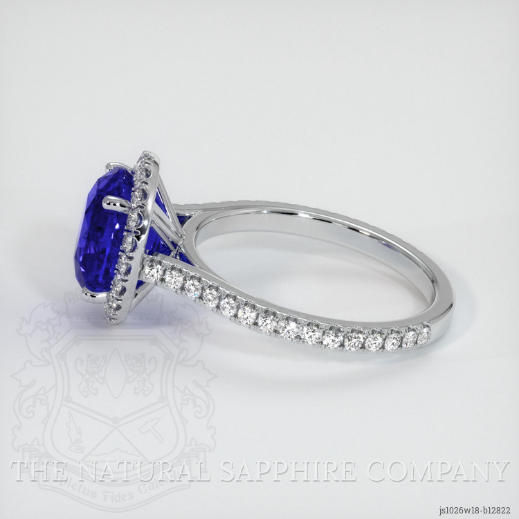 The ring features a beautiful, transparent GRS certified Vivid Blue “Royal Blue” 4.05 carat oval shape blue sapphire with the dimensions of 9.70 x 8.02 x 5.97 mm and a mixed brilliant cut. It has a clarity grade of very slightly included (evaluated at eye level), vivid color saturation, and an excellent polish. The origin of this sapphire is Madagascar.
